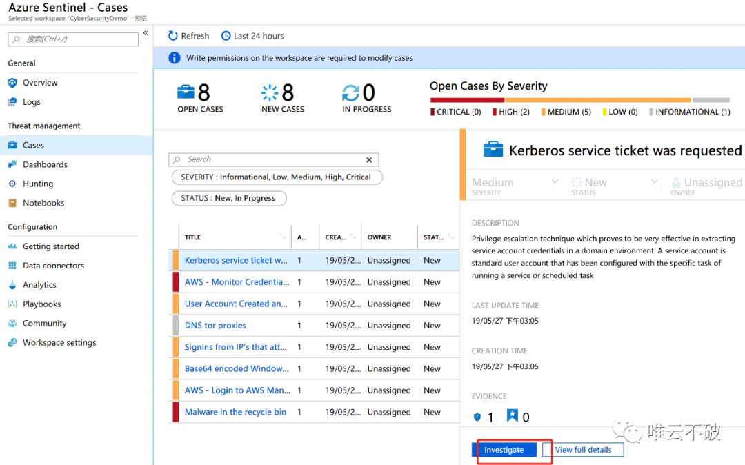 接下来,我们来看下Azure Sentinel中最强大的部分之一,案件的生成。