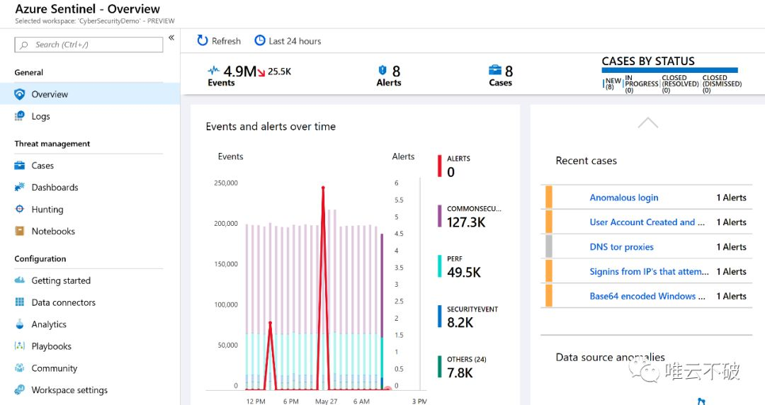 Azure Sentinel的默认仪表板首先会将所监控到的所有日志中所产生的事件,网络峰值等信息按时序的展现给客户,并且把从事件所引申出来的威胁警报及案件,作为客户最关心的重点展现在首页。