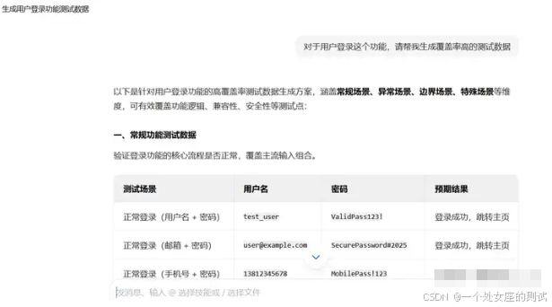 比如直接让AI生成测试数据,以前我们人工生成的测试数据,不但耗时繁琐而且生成的数据非常的不规范。效果不好还测试不出问题来。现在只要所自己的需求和测试数据的格式或示例给AI就能生成大量的测试数据。