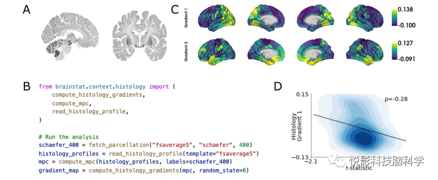 图6.与组织学标记物的关联。(A)从大脑图谱中选择矢状面和冠状面切片。(B)计算Schaefer-400分割的微观结构剖面协方差梯度的Python代码。(C)梯度来自于大脑图谱的微观结构剖面协方差。(D)t-统计图的散点图和微观结构剖面协方差的第一个梯度的相关性。
