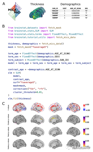 图2.拟合年龄对皮层厚度影响的固定效应一般线性模型的Python代码。(A)BrainStat包含的MICA-MICS数据集包含皮层厚度和人口统计学数据。人口统计学数据包含散列的被试ID(SUB_ID)、扫描次数、年龄z分数(AGE_AT_SCAN)和性别(SEX)。(B)我们创建了一个以𝒀=𝒊𝒏𝒕𝒆𝒓𝒄𝒆𝒑𝒕+𝒂𝒈𝒆+𝒔𝒆𝒙+𝒂𝒈𝒆∗𝒔𝒆𝒙+𝒓𝒂𝒏𝒅𝒐𝒎(𝒔𝒖𝒃𝒋𝒆𝒄𝒕)的形式的线性模型。请注意,默认情况下,截距将包含在模型中。第三,我们用年龄初始化模型的对比数据,并要求用随机场理论校正的p值(即“RFT”),以及用错误发现率校正的p值(即“FDR”)。最后,我们将该模型与皮层厚度数据进行了拟合。(C)负t值(蓝色)表示皮层厚度随年龄的增长而减少,而正t值(红色)表示皮层厚度随年龄的增长而增加。随机场理论(RFT)校正(团簇水平阈值p<0.01)以及通过错误发现率(FDR)校正得到的顶点水平p值(p<0.05)的结果显示了显著的峰值和聚类方面的p值(p<0.05)。为了简洁起见,我们省略了图形绘图代码。这个模型的Python和MATLAB代码,以及绘制这些图形的代码,可以在补充的Jupyter和实时脚本中找到。