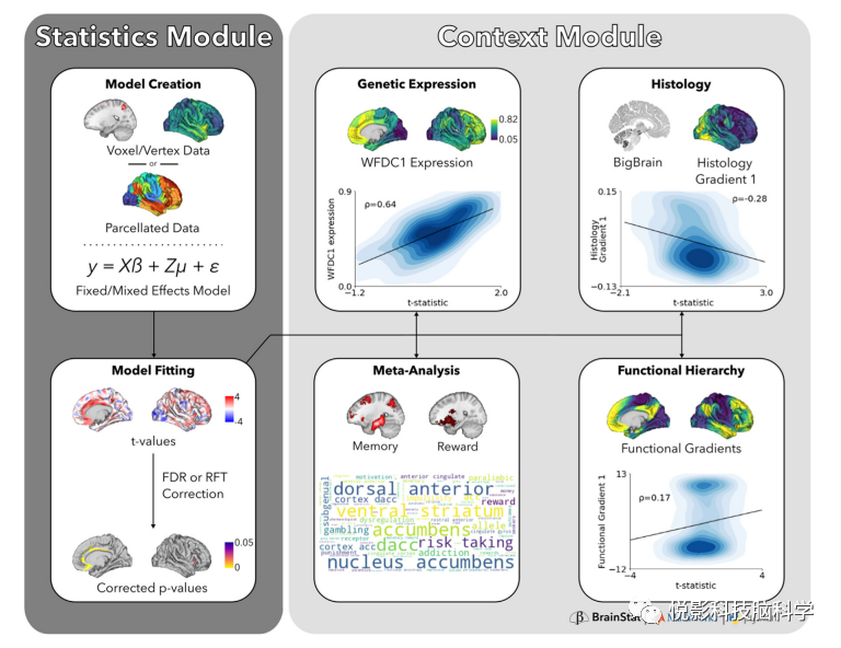 图1. BrainStat工作流程。工作流程被分为一个统计模块(深灰色)用于固定和混合效应线性模型,一个背景化模块(浅灰色)用于与外部数据集上下文化结果。要使用统计模块,用户必须提供体素、顶点或包裹水平的数据,必须指定固定或混合效果模型,并且必须指定模型对比度。一旦指定了这些,BrainStat计算t值并修正模型的p值。t值图或任何其他大脑图可以用于上下文模块,将统计结果与任务功能磁共振元分析的标记嵌入,并建立功能层次、遗传表达和组织学标记。