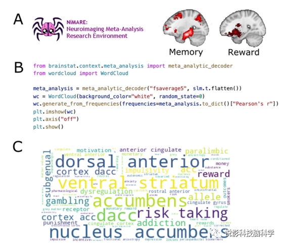 图3. 荟萃分析解码。(A)使用NiMARE工具箱和Neurosynth数据库,我们为Neurosynth数据库中的每个特征名称获得了特征图。我们展示了一个术语“记忆”和“奖励”的关联映射示例。(B)示例Python代码,用于计算t统计图和Neurosynth数据库中的每个术语之间的相关性,并将这些相关性绘制成一个词云图。(C)从图3B中的代码中生成的词云图。