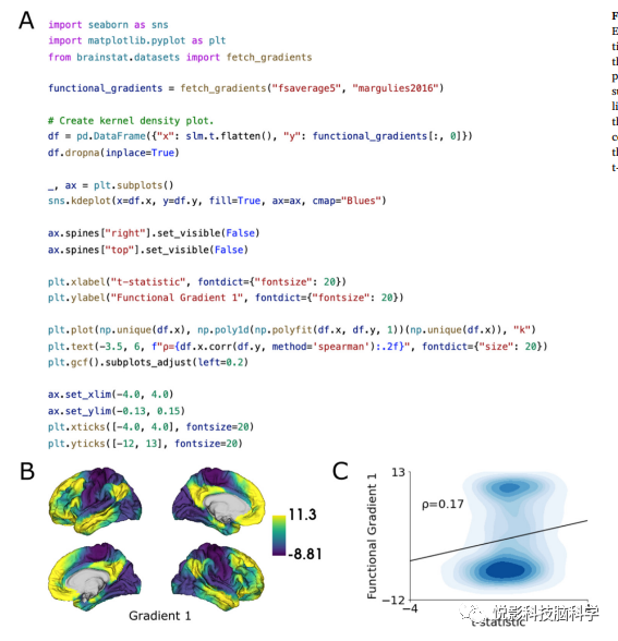 图4. 与功能梯度的关联。(A)用于计算和绘制t统计图和第一个功能梯度的相关性的Python代码。为了简洁起见,我们省略了皮层表面绘图代码。(B)第一个功能梯度绘制在大脑表面。(C) t-统计图和第一个功能梯度相关性的核密度图。