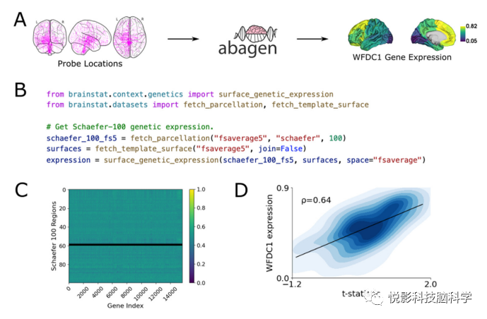 图5.与基因表达的关联。(A) BrainStat利用艾伦脑科学研究所提供的艾伦人脑图谱的数据,并用abagen进行处理,获得数千个基因的转录水平。图中显示了所有探针的位置以及一个基因(WFDC1)单个基因在100个功能定义区域内的表达。(B)基于表面分割的遗传表达式的Python代码。(C)遗传表达矩阵描述了所有包裹中所有解析基因的遗传表达。黑色的行表示没有样本的区域。(D)t-统计量图与WFDC1基因表达的相关性。