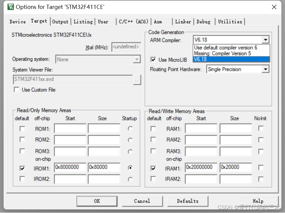 3.点击 Target 选项卡,找到 ARM Compiler: 下拉列表。
