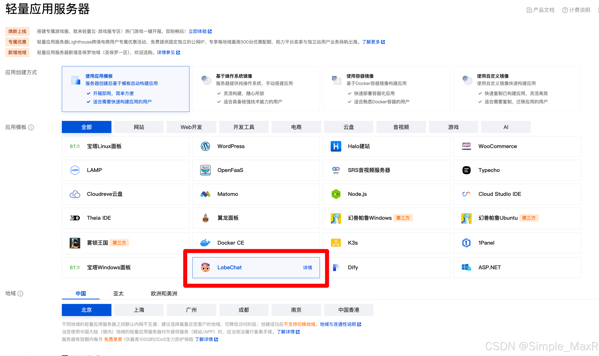 这里我们直接选择 LobeChat 镜像模板,然后选一个靠近自己的地区