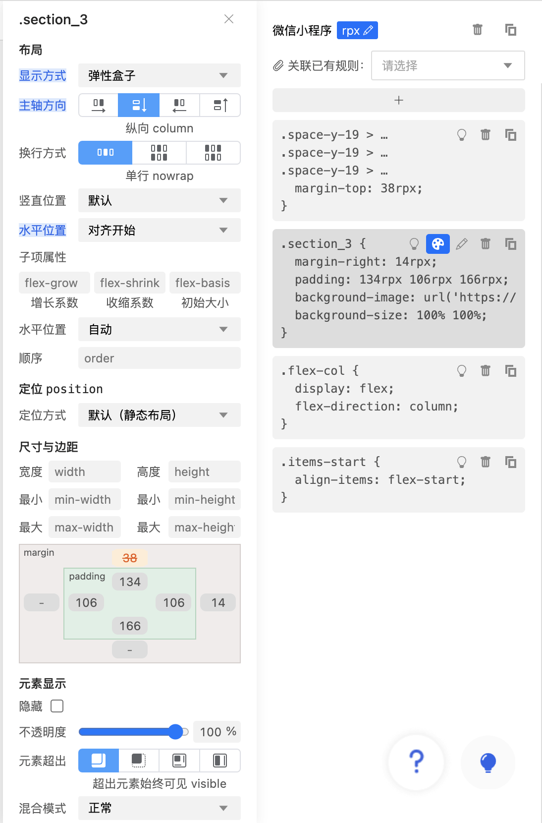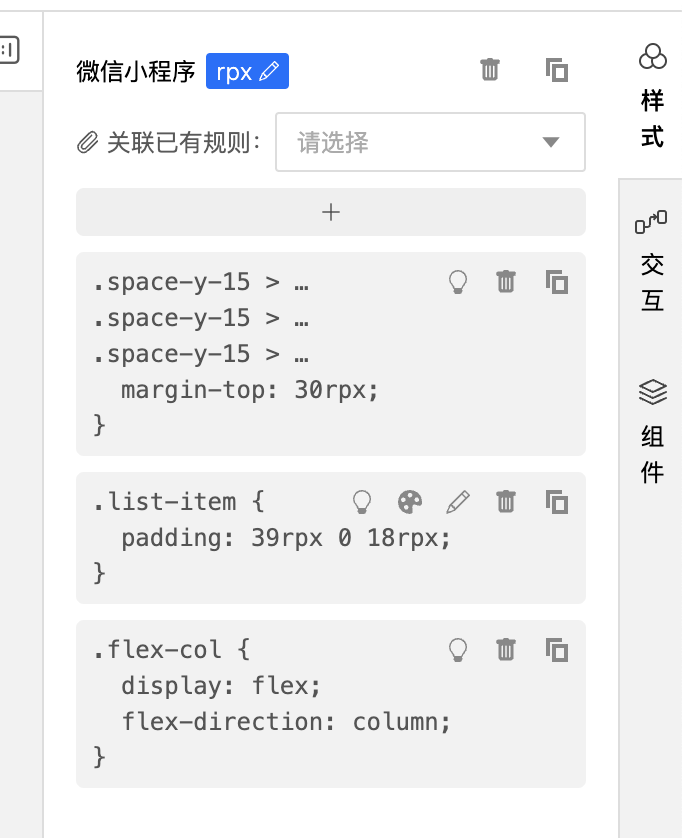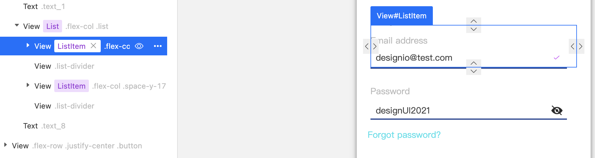 设计稿中的列表也是自动识别了,从布局上使用了 flex 纵向布局,从代码上,使用 data 数据循环生成,可以说这个思路非常的程序员化,而不是中看不中用的 “人工智障”