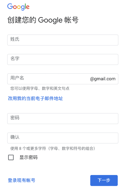 2、在谷歌帐号创建页面,输入您要创建的Google帐号信息,并继续下一步;