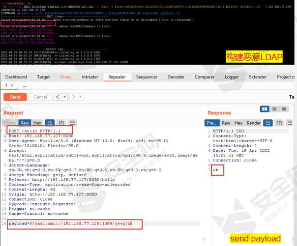 从攻击方视角来看,攻击者通过搭设的恶意LDAP服务器,在存在JNDI注入漏洞的Log4j组件中,攻击者通过修改日志配置文件,构建恶意配置使用JDBC Appender和引用JNDI URI的数据源,实现执行远程代码。如图16所示。