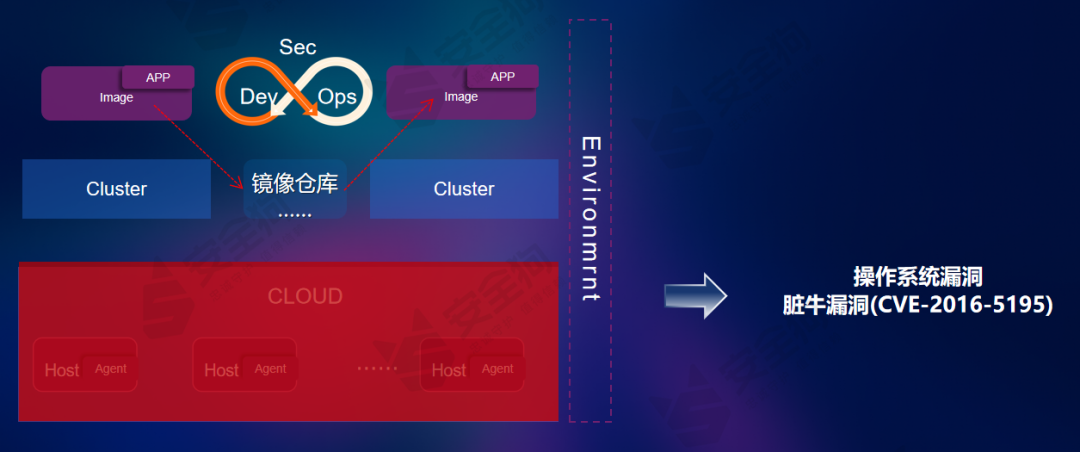 以Cloud层级为例,当攻击者要从云原生容器环境入侵到宿主机环境时,需要寻找一个突破的“漏洞”。在云原生环境,脏牛漏洞本身就作为Linux系统低权限提升到高权限的内核漏洞,同样也能在容器环境中提权到宿主机。