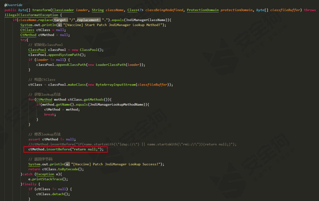 在核心代码中还包含了修改lookup方法的关键操作,使用javassist框架对类org.apache.logging.log4j.core.net.JndiManager中的lookup方法进行修改,在方法开头直接添加return null,让该方法直接跳出,而不进行接下来的恶意操作,阻止对该漏洞的利用,如图19所示。