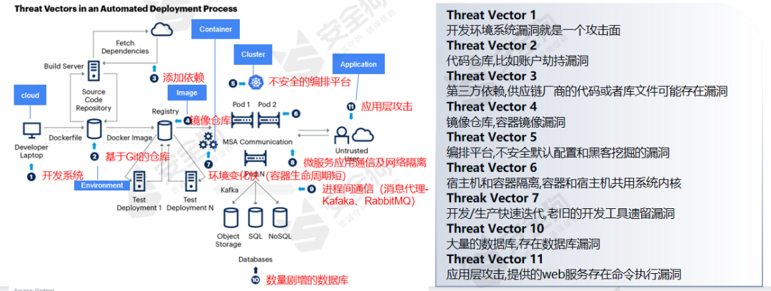 “CCICAE”云原生漏洞攻击面模型可与Gartner的容器环境威胁向量产生对应,如图3所示。