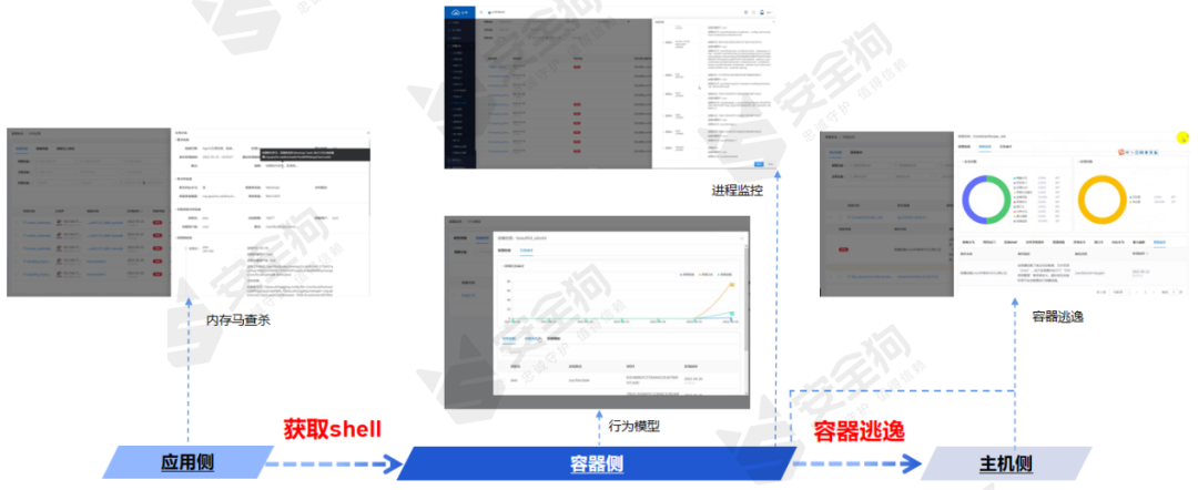 运行时异常进程行为分析。通过行为捕获未知漏洞检测,大多数未知行为,是无法通过规则匹配检测出来的,因而可通过行为分析来发现未知威胁。基于行为模型的未知威胁检测,可有效捕获0Day攻击事件。