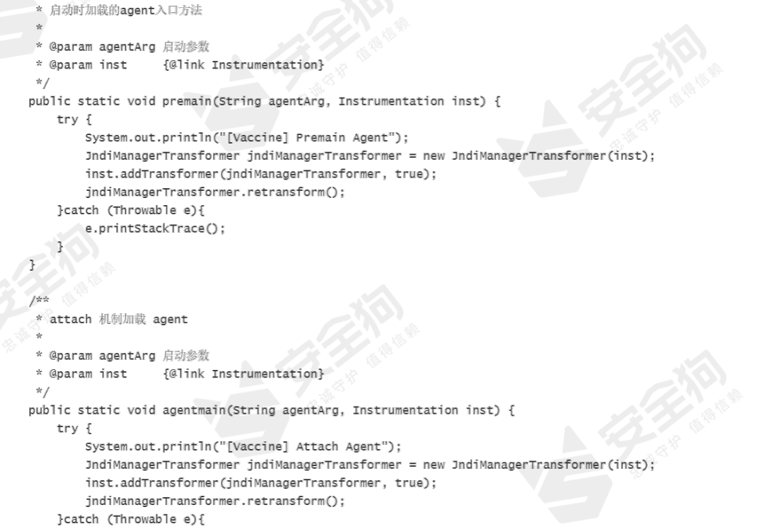 通过分析某“Log4J RCE的热补丁”,可发现Java Agent模块的核心代码中定义了两种加载模式:在启动时加载的“premain方法”和通过attach机制加载的“agentmain方法”,也即同时支持热部署和冷部署,如图18所示;