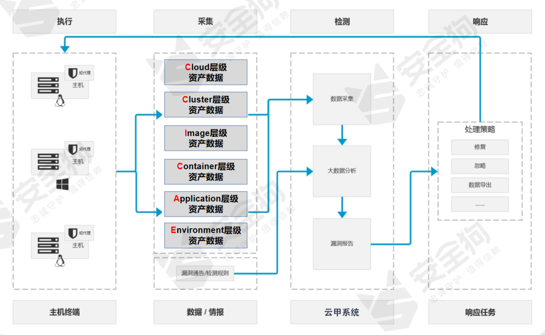 根据事前“漏洞情报”与事中“漏洞行为检测”,追踪出漏洞事件的态势信息,如:漏洞影响的范围、应用、版本、主机等等,主动在CCICAE模型的不同层级的资产上,进行相关云原生资产采集及漏洞扫描。采用此种方式采集扫描数据精确高效,所检测出的漏洞信息可帮助用户根据不同的业务场景和漏洞风险等级,采取不同的处置措施,如图25所示。