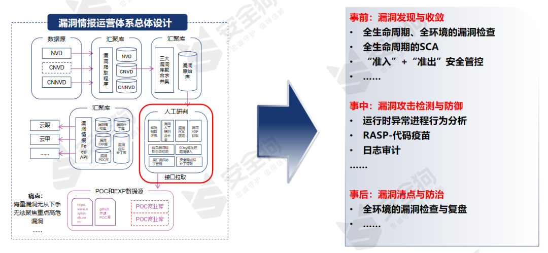 安全狗经过多年对漏洞的研究积累与技术沉淀,结合漏洞情报运营与研究以促进漏洞防御,形成一套精准的漏洞专家知识库和全生命周期的漏洞检测与防治方案,输出高质量的高风险漏洞情报的研究成果赋能到产品,缓解“海量漏洞无从下手,无法聚焦重点的高危漏洞”的痛点。如图1所示,该方案分别从事前、事中和事后进行漏洞防御和响应。