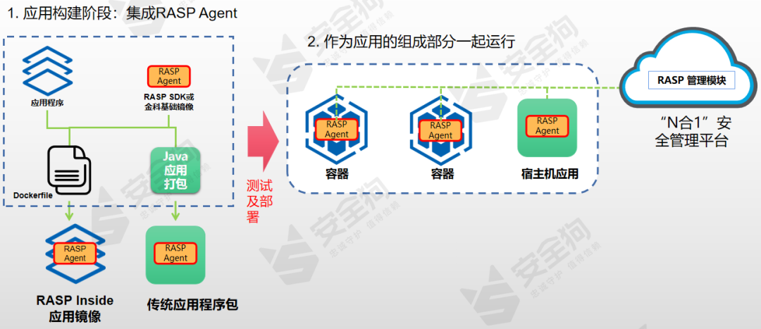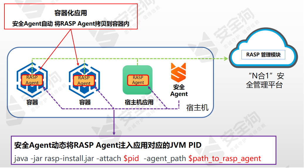 RASP代码疫苗技术。RASP以探针的形式将保护引擎注入到被应用服务中。当RASP检测到应用服务的代码执行有异常时,可以做阻断或者告警。安全狗的云原生容器Java RASP使用了Instrumentation/JVMTI的API来实现动态修改Java类字节码并插入监控或检测代码,实现热部署和冷部署两种方案,热部署是在Java应用运行时进行加载,如图13所示;而冷部署是在Java应用启动时采用命令参数的形式进行加载,如图14所示。
