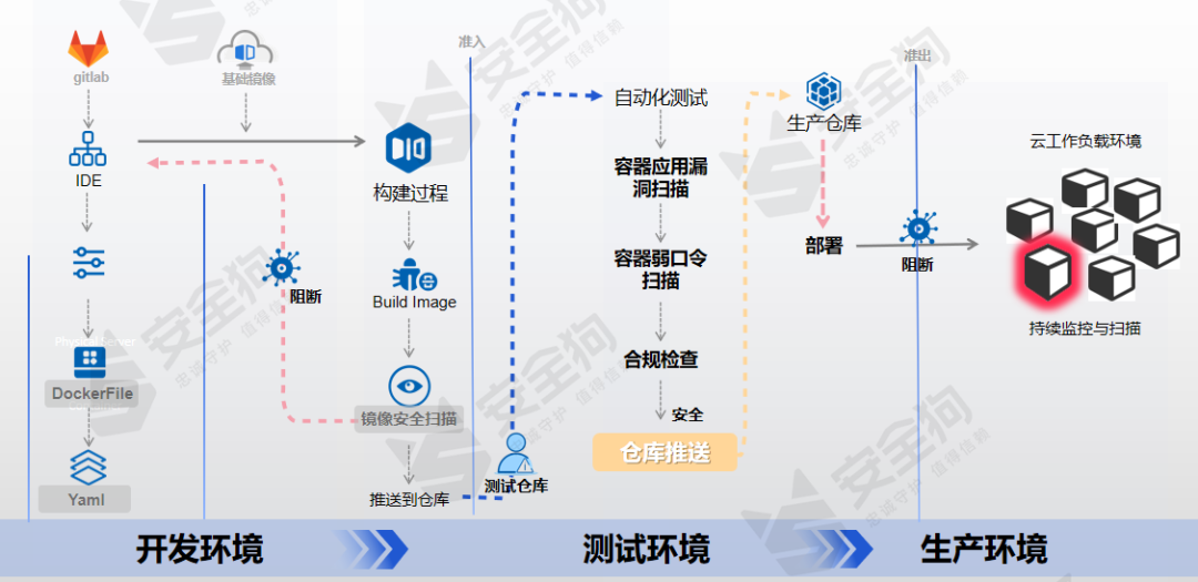 在事前,进行漏洞发现与收敛:如全生命周期、全环境的漏洞检查、全生命周期的SCA分析、“准入”+“准出”安全管控;