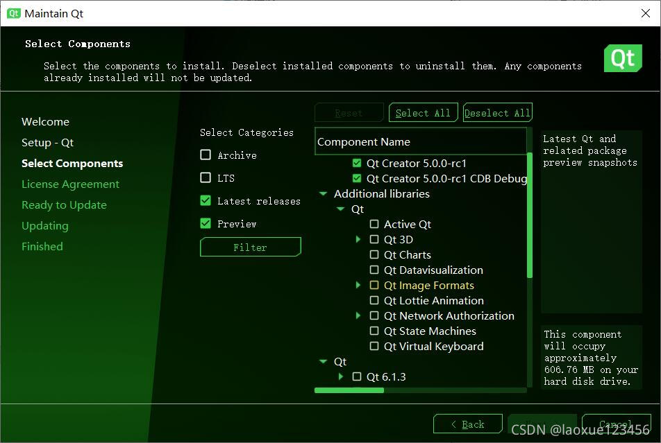 在Qt的安装目录下,可以看到Qt自带的更新工具。它可以帮助我们增删组件,如添加不同版本的编译环境、QtCreator等,非常方便。