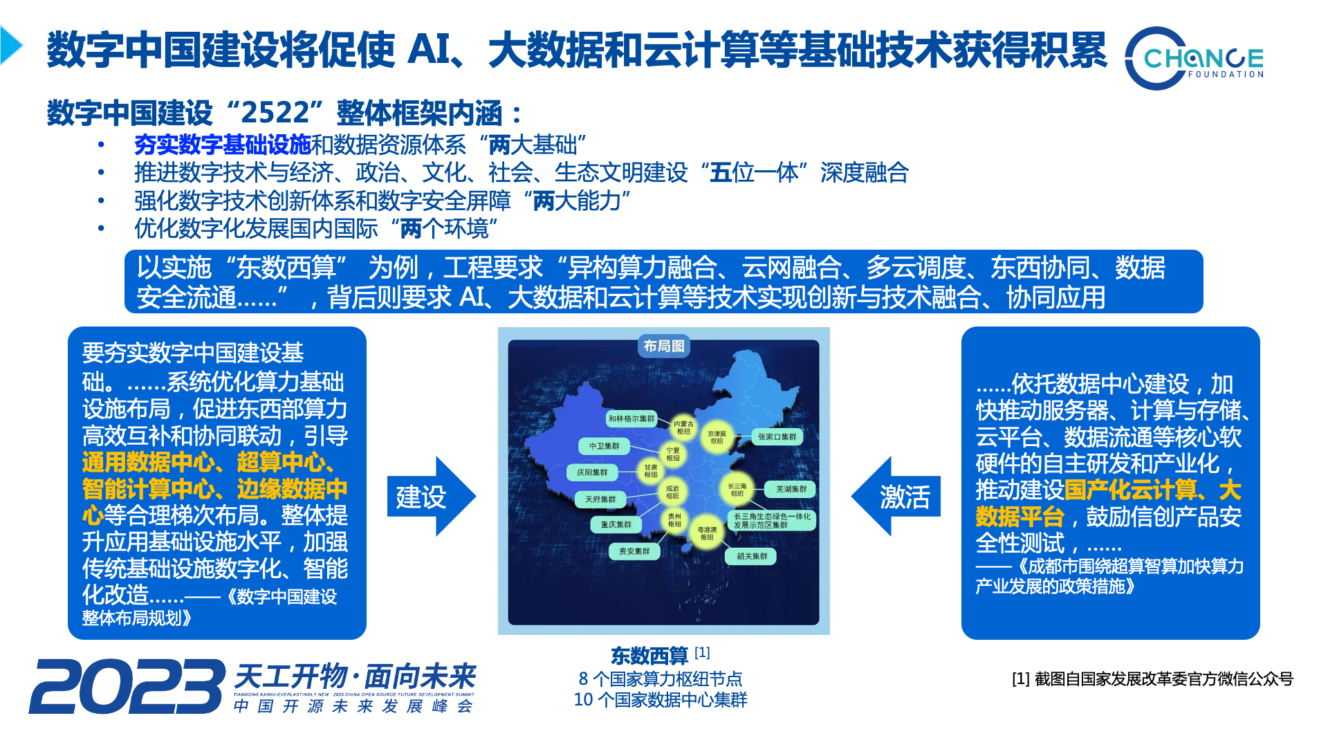 数字中国建设规划宏大、系统且全面,我认为其中对基础关键技术发展促进最大的方面,是来自“2522”框架中“两大基础”之一,夯实数字基础设施这个重要策略。以这几年大力发展的“东数西算”工程为例,它布局规划了众多的通用数据中心、超算中心、智能计算中心、边缘数据中心,并且提出了“异构算力融合、云网融合、多云调度、东西协同、数据安全流通……”等一系列的发展要求,这显而易见会促使人工智能、大数据和云计算等基础技术的创新,将他们进行融合、协同应用是未来的重要发展方向。