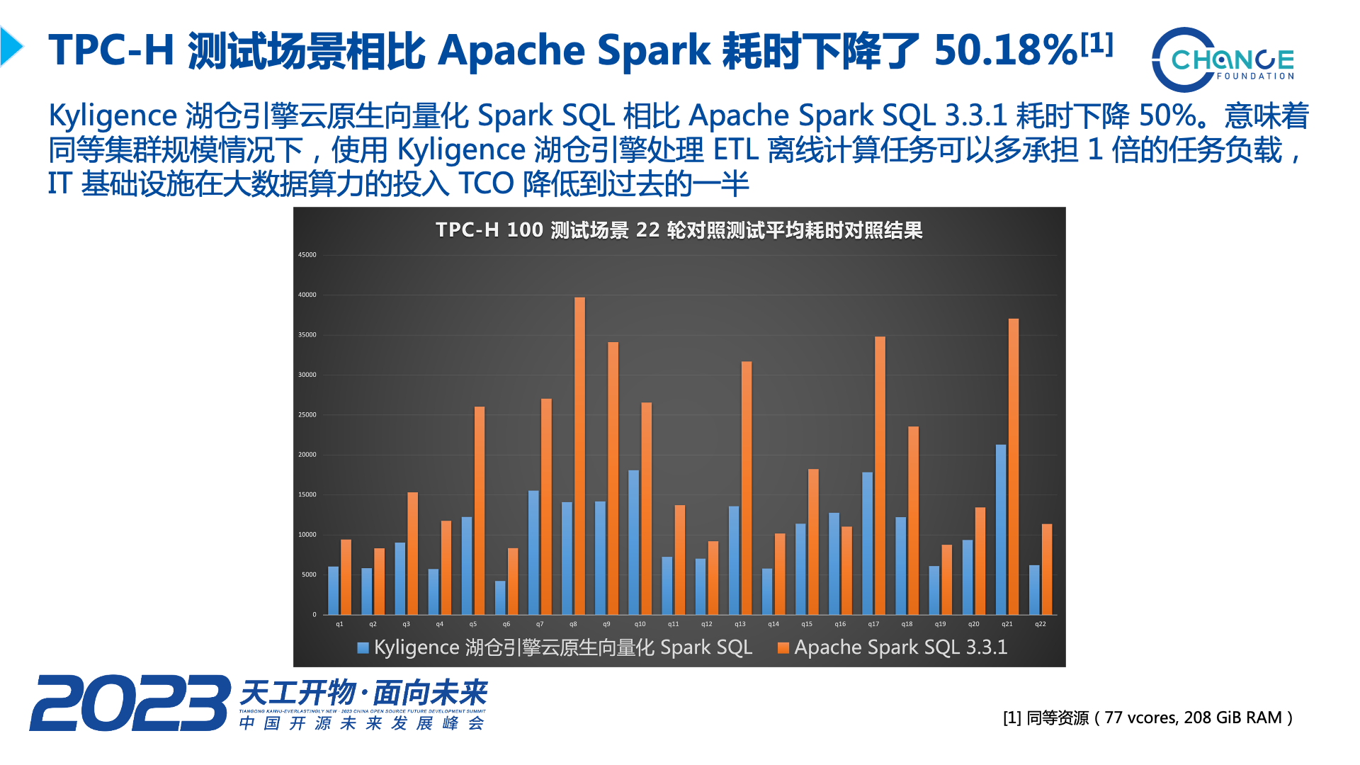 接下来把 Kyligence 湖仓引擎与 Apache Spark 在 TPC-H 场景下测试报告分享给大家,可以看到向量化的 Spark 引擎通过性能提升,节省了一半的计算资源,为用户降低了 50% 的使用成本。自从决定对他提供商业化支持后,Kyligence 正在加倍投入资源,使这项技术以更快的速度进步。我们希望有更多的原本使用 Spark 作为计算引擎的用户,能尝试使用 Kyligence 湖仓引擎来获得更低的使用成本,更好的使用体验,邀请大家一起推动这项新技术进步、产生价值。