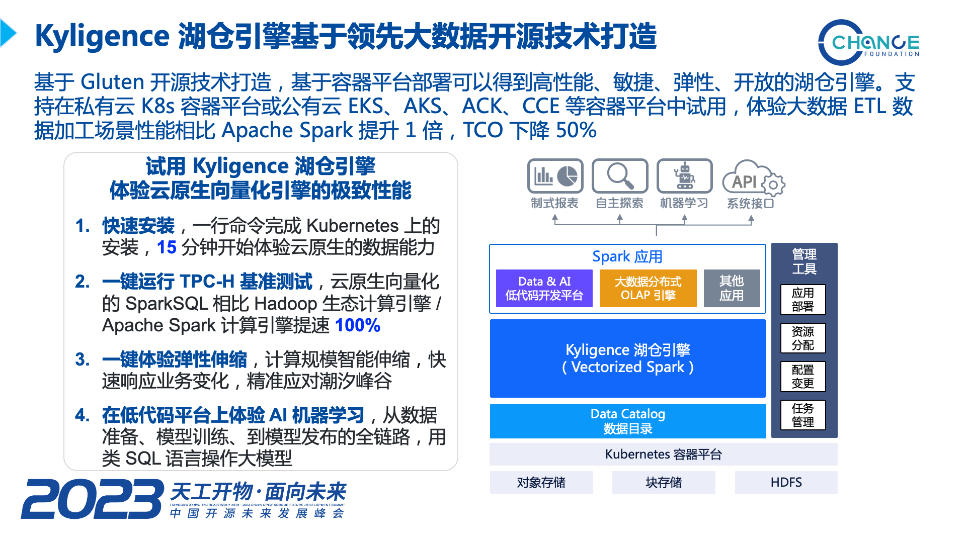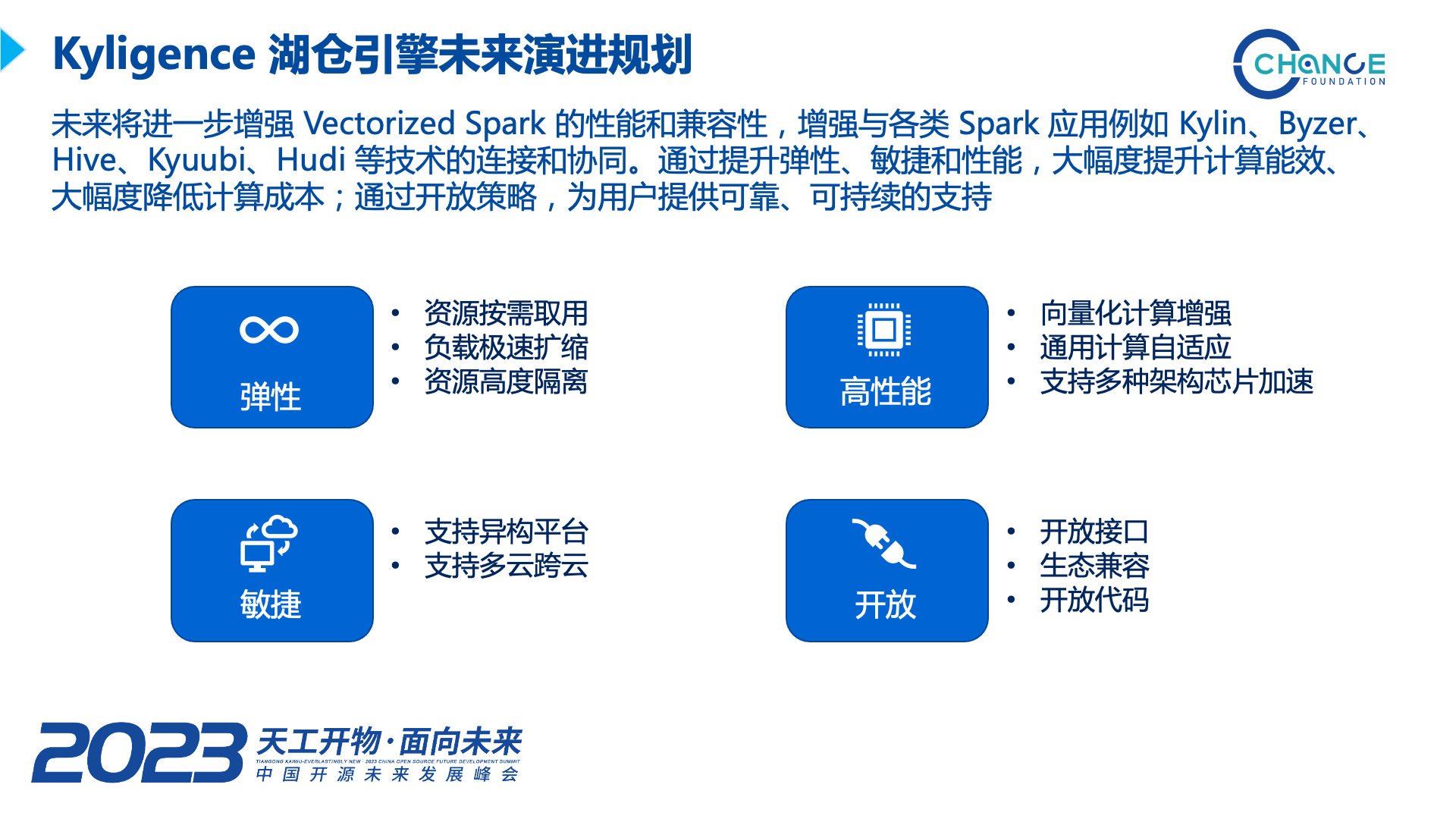 2023 中国开源未来发展峰会于 5 月 13 日成功举办。在大会开源原生商业分论坛,Kyligence 解决方案架构高级总监张小龙发表《云原生大数据底座演进 》主题演讲,向与会嘉宾介绍了他对开源发展的见解,数据底座向云原生湖仓一体架构演进的趋势,以及 Kyligence 湖仓引擎能够在构建下一代云原生数据底座发挥重要价值,通过提升计算性能,大幅度降低计算成本。