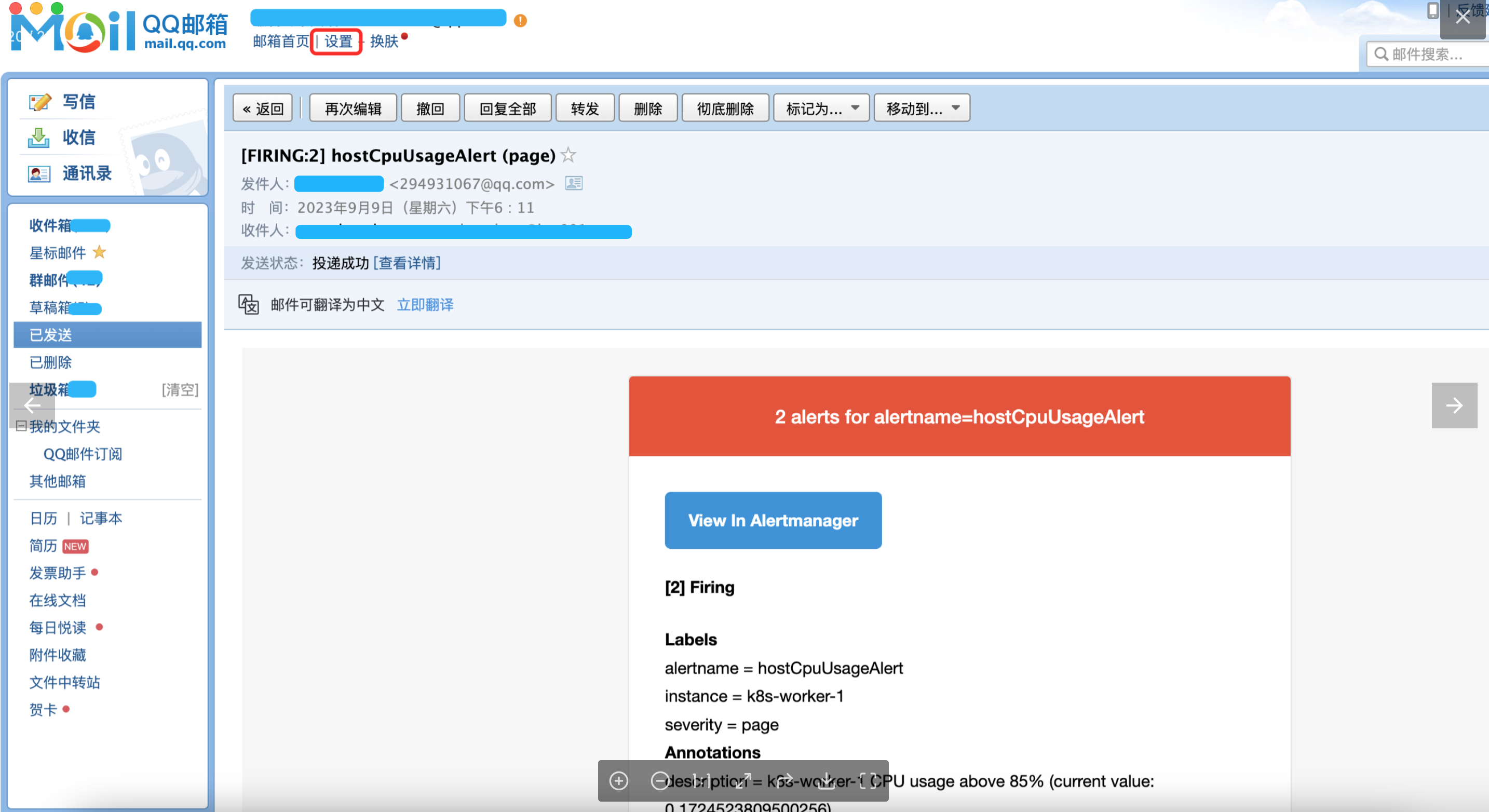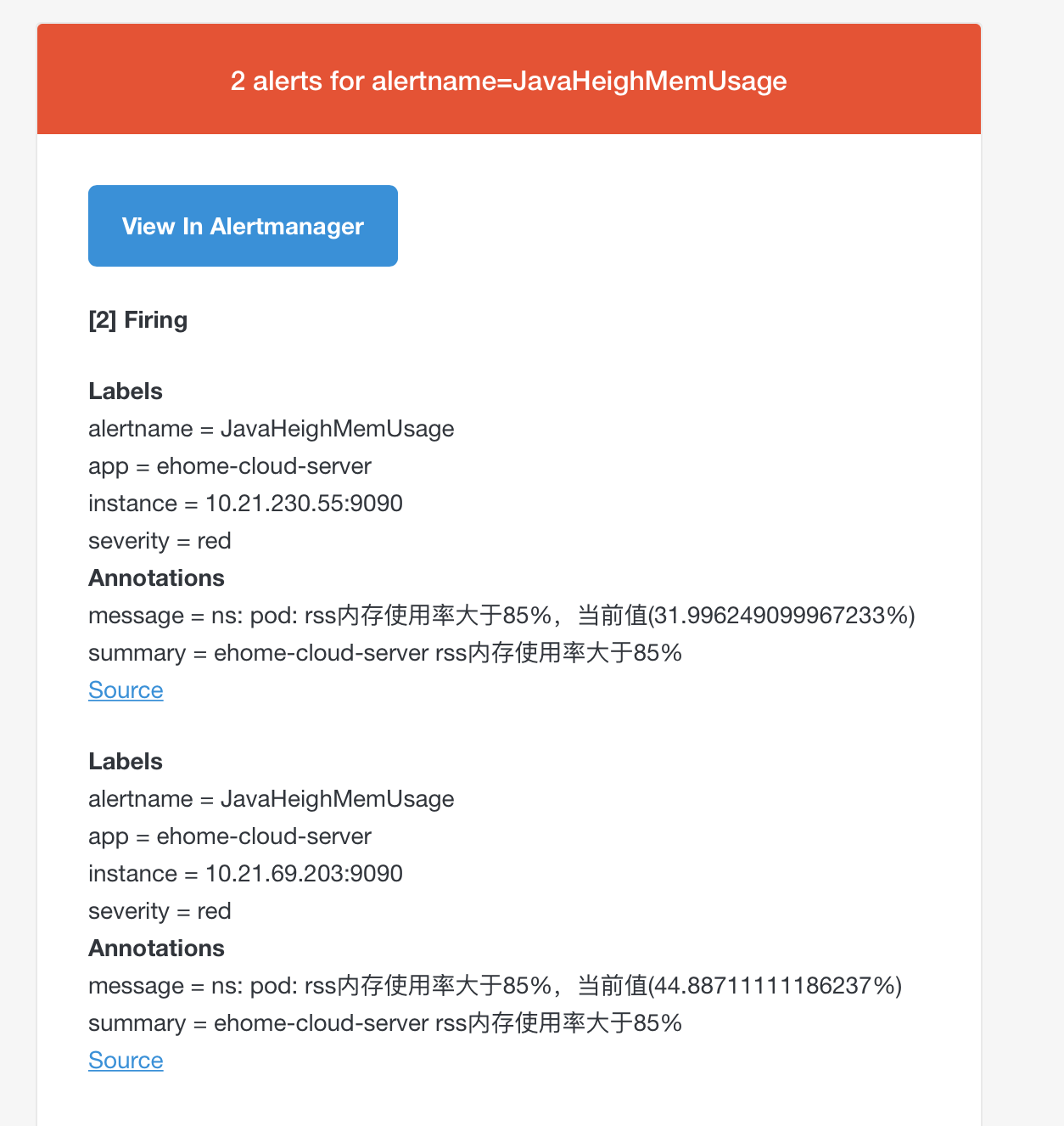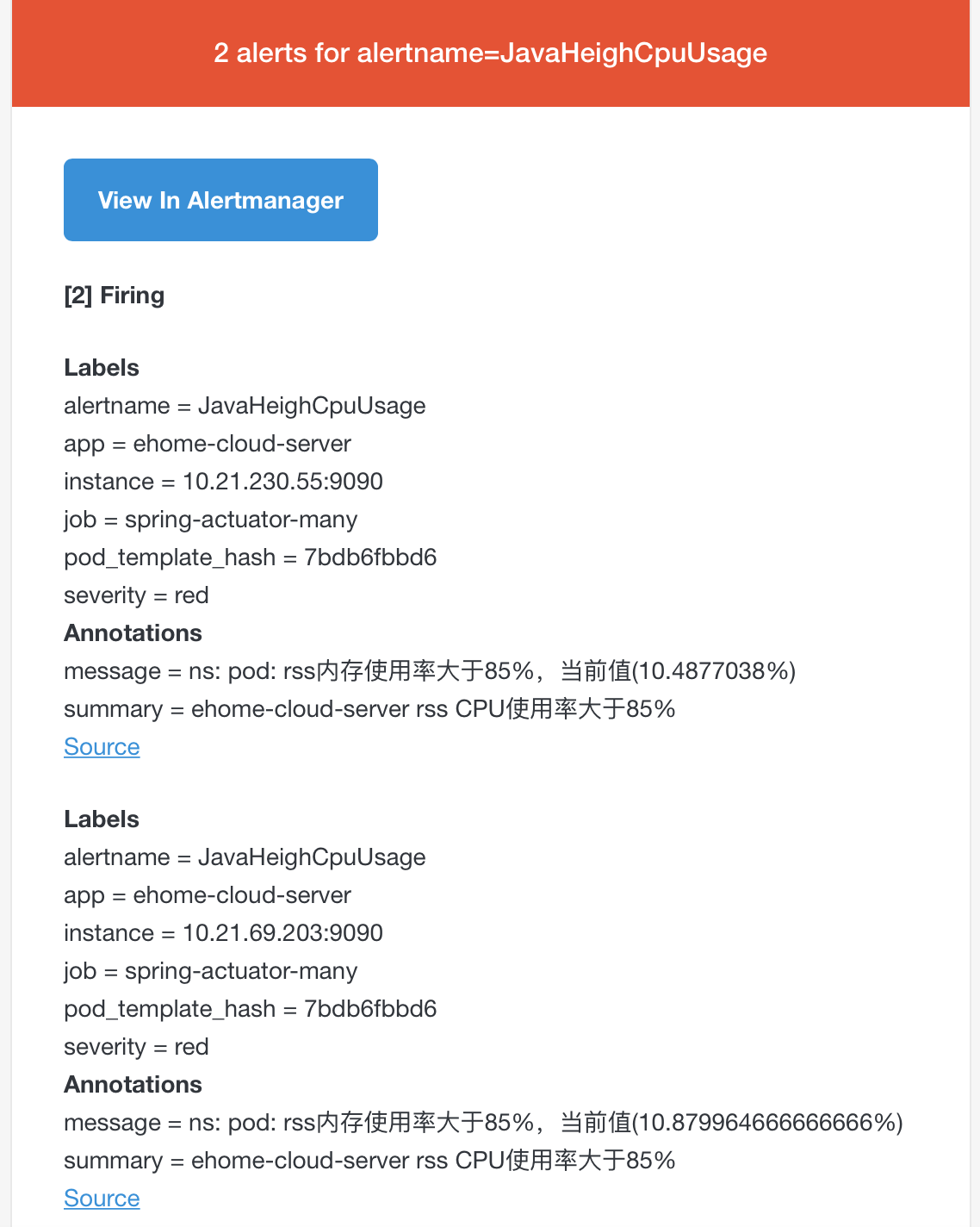 - 方式1:将告警规则值调低,会收到如下邮件: