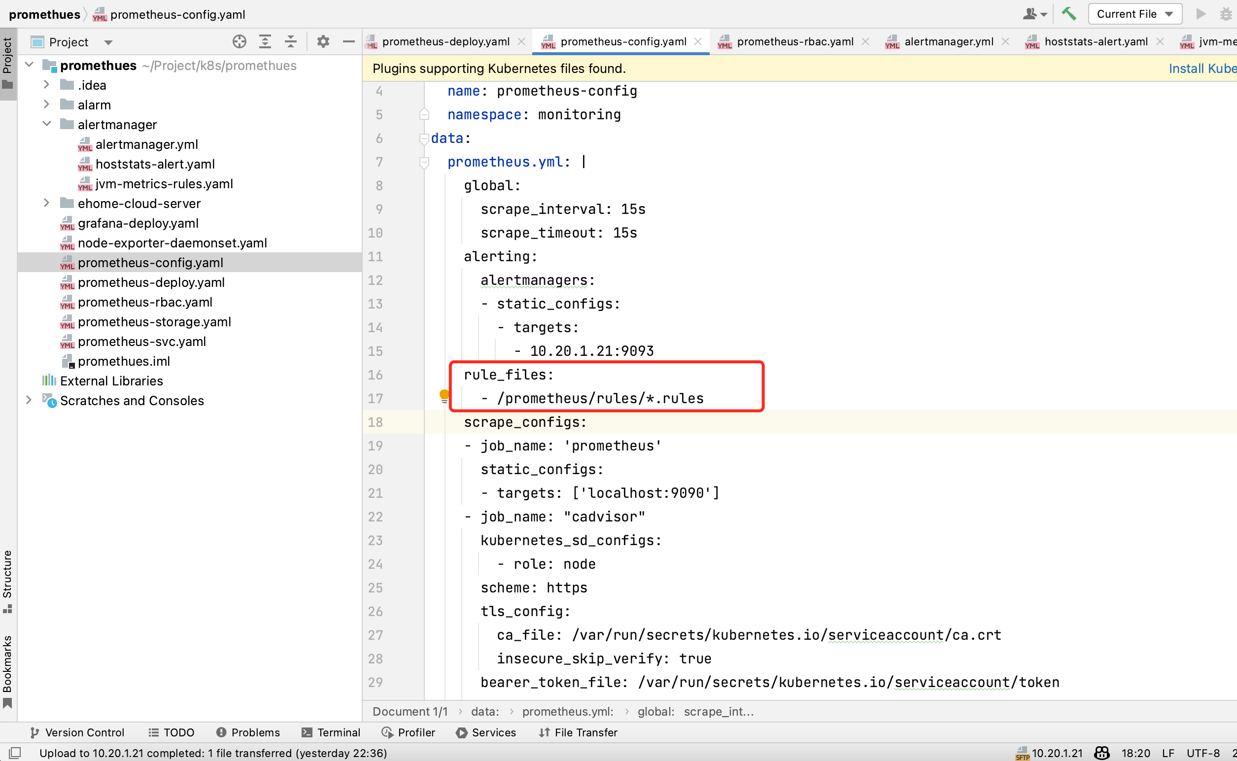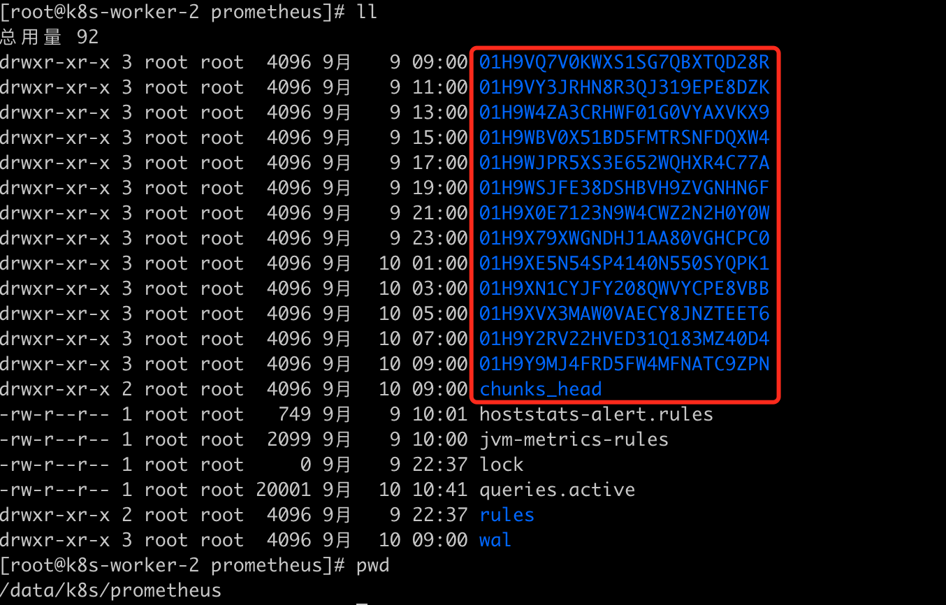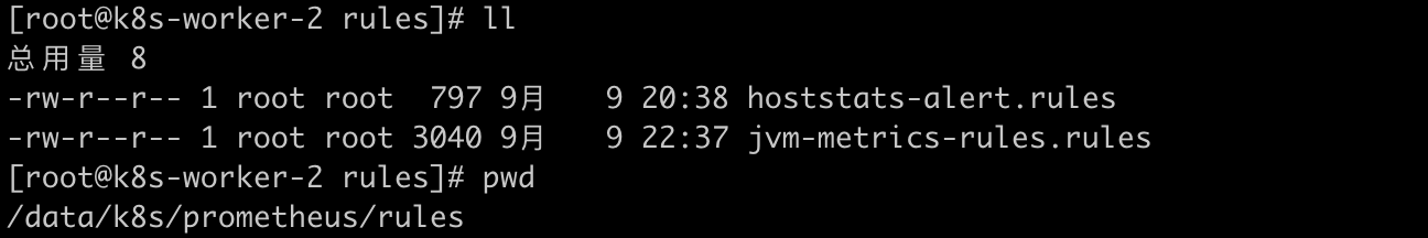 注意此处的文件目录/prometheus/是prometheus所在存储目录,我这里是安装在k8s-worker-2下,然后在prometheus的存储目录下建立/rules文件夹,如下图:
