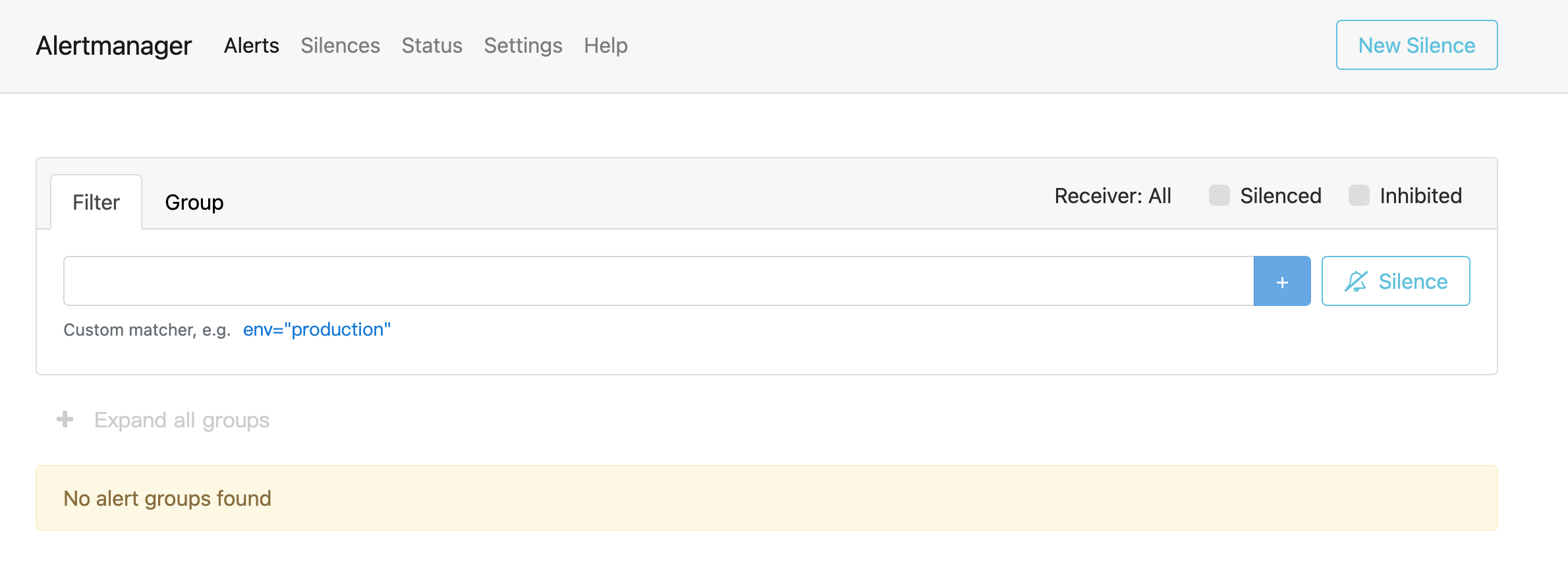 安装完毕之后,通过如下链接访问:http://10.20.1.21:9093/#/alerts,界面如下: