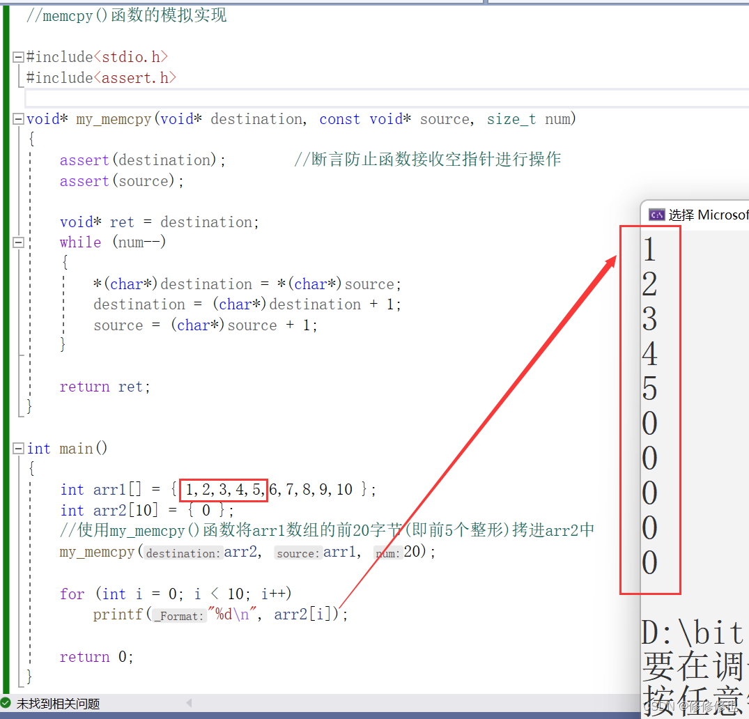 如下,我们使用memcpy()函数将arr1数组的前20字节(即前5个整形)拷贝进arr2中: