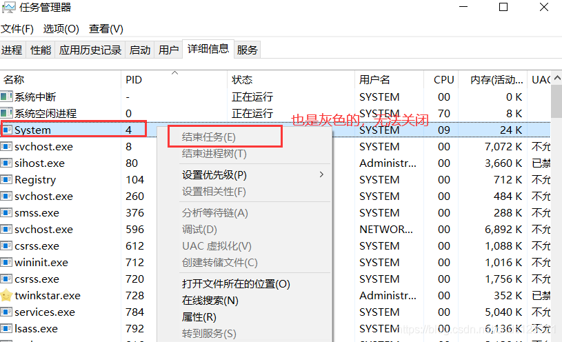 一般情况下是使用taskkill /pid 4 /f 强制关闭进程。