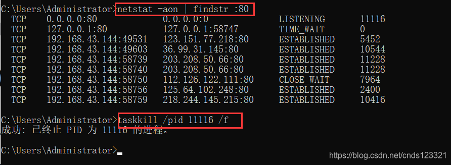 使用下面的命令查看80端口被谁占用了,后面的80就是端口号,如果要查找那个端口号被占用了,将80改为指定端口号即可。