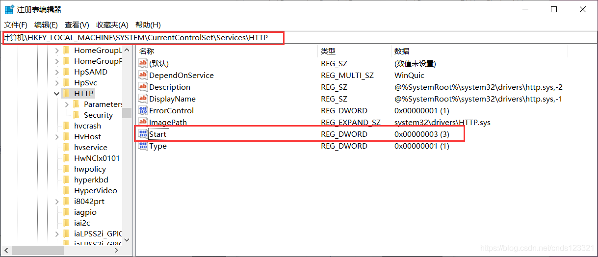 找到计算机\HKEY_LOCAL_MACHINE\SYSTEM\CurrentControlSet\Services\HTTP下的Start