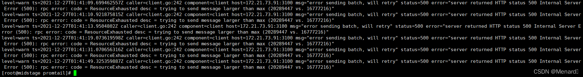 1、当日志量过大时候,promtail就报以下错误rpc error: code = ResourceExhausted desc = trying to send message larger than max