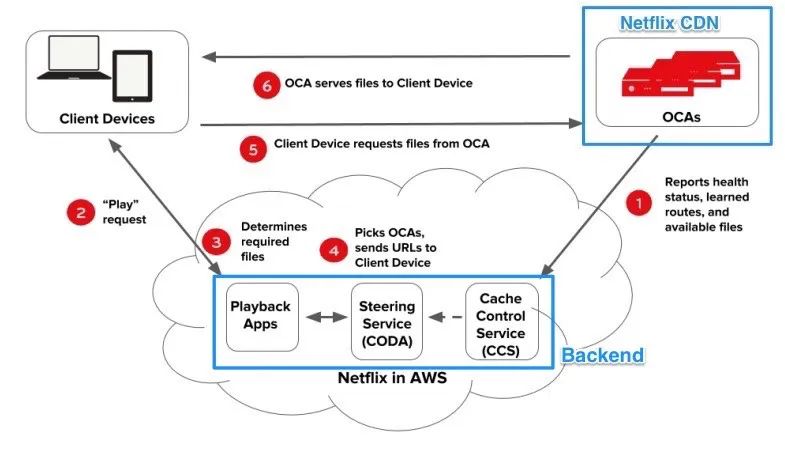 当用户在自己的应用程序或设备上点击播放按钮时,客户端将与AWS上的Backend和Netflix CDN上的OCAs进行通信,以流化视频([[7])。) 下图说明了播放过程的工作原理。