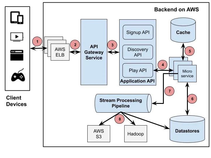 在上图中,Playback Apps服务、Steering服务和Cache Control服务完全是在AWS云上运行的微服务。在下一节中,我将介绍Netflix后端微服务架构,它提高了服务的可用性和可扩展性。