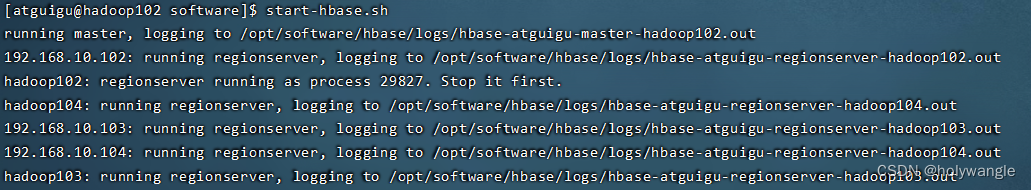 hadoop102: running regionserver, logging to /opt/software/hbase/logs/hbase-atguigu-regionserver-hadoop102.out