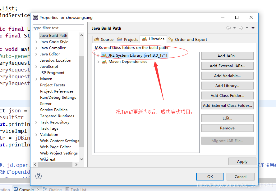 Exception in thread "main" java.lang.UnsupportedClassVersionError: com/css/test/JDBindServiceImpl : Unsupported major.minor version 52.0