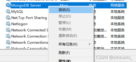 依旧是按m键快速找到MongoDB–>启动(下面点击属性还是右键这个MongoDB server)