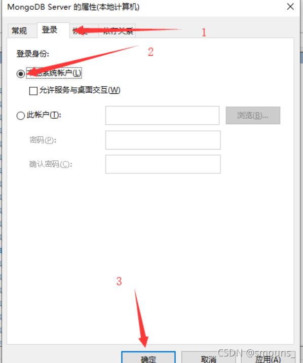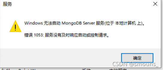 MongoDB安装不了…出现如下的错误提示:这里直接点击Ignore忽略,然后打开任务管理器–>服务–>(随便点击一个服务按下m键快速找到MongoDB)–>打开MongoDB服务依旧是按m键快速找到MongoDB–>启动(下面点击属性还是右键这个MongoDB server)会出来这个提示确定后右键–>属性回到任务管理器的服务,右键MongoDB–>开始就可以