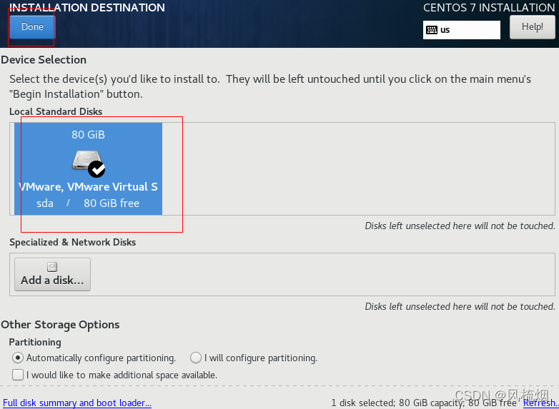 15.设置安装路径。 此处我们仅有一个磁盘默认选择后点击“Done”退出
