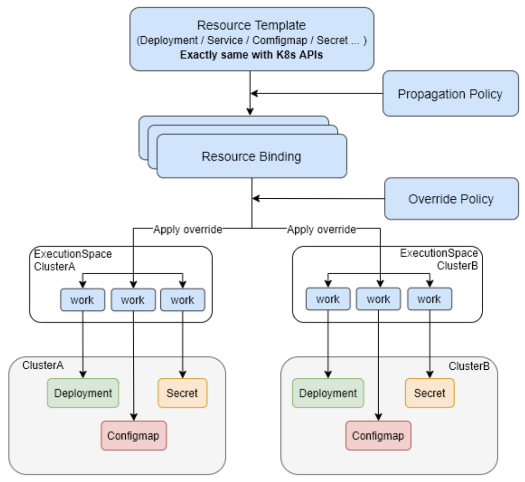 5.11 Execut控制平面中,会为每一个被纳管的集群创建一个集群相关的 namespace,这个 namespace 中存放的资源对象是 work。每一个和这个集群相关的 Kubernetes 资源对象都会对应到这个 namespace 下的一个 work。