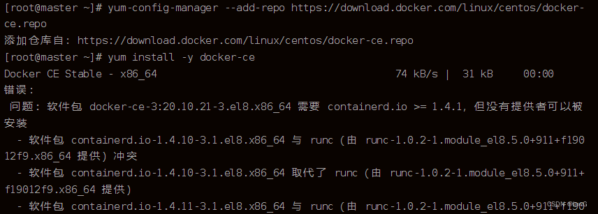 - 软件包 containerd.io-1.4.10-3.1.el8.x86_64 与 runc(由 runc-1.0.2-1.module_el8.5.0+911+f19012f9.x86_64 提供)冲突