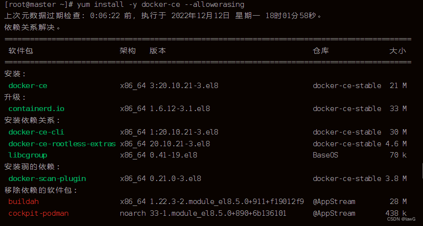 yum install -y docker-ce报错软件包docker-ce-3:20.10.21-3.el8.x86_64 需要 containerd.io >= 1.4.1但没有提供者可以被安装(尝试在命令行中添加 '--allowerasing' 来替换冲突的软件包 或 '--skip-broken' 来跳过无法安装的软件包 或 '--nobest' 来不只使用软件包的最佳候选)