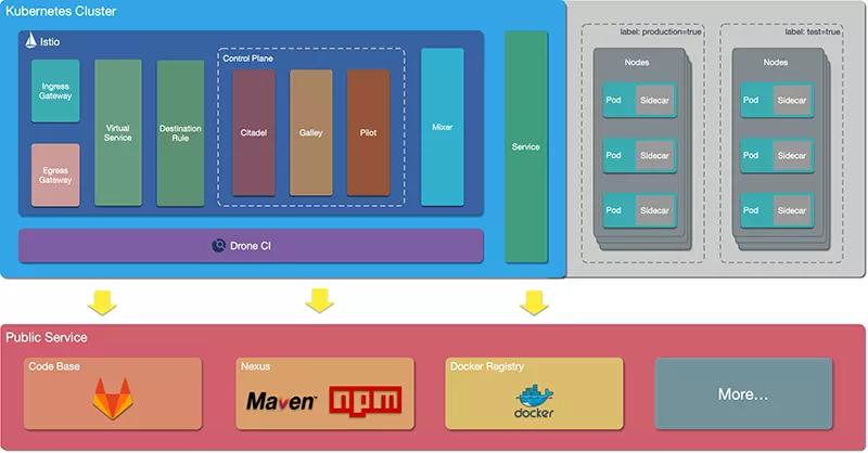 那么一个高可用的Kubernetes集群是必不可少的,然后将其余的一切交给它管理就是一个水到渠成的过程。部署和管理微服务的生命周期,让微服务具备自动伸缩、可扩展和高弹性的能力。像上图中的一些公共服务,则可以独立于Kubernetes 之外部署,当然也可以根据实际情况调整。最后配置好自动化流水线,就可以展现 DevOps 的威力了。