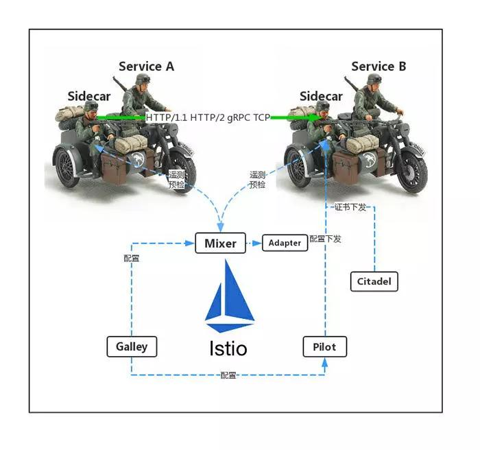 - Istio 在数据平面为每个服务中注入一个 Envoy 代理以 Sidecar 形式运行来劫持所有进出服务的流量,同时对流量加以控制,通俗的讲就是应用程序你只管处理你的业务逻辑,其他的事情 Sidecar 会汇报给 Istio 控制平面处理
