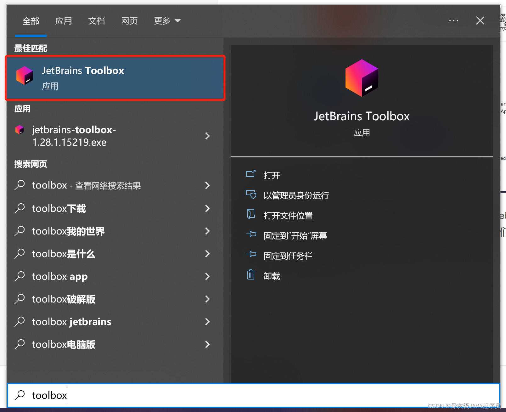 运行下载下来的安装包完成Toolbox App的安装,安装完成后并没有在桌面创建快捷方式,右键我们的开始菜单,点击搜索并输入toolbox