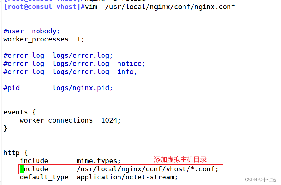 include /usr/local/nginx/conf/vhost/*.conf; #添加虚拟主机目录
